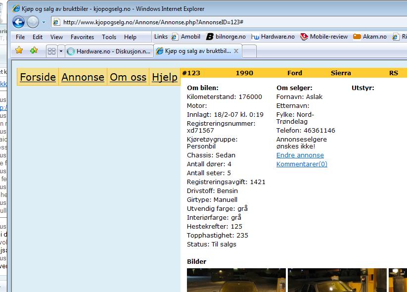 Skavold Skrevet 18. februar 2007 Skrevet 18. februar 2007 Ang. det med Javascript/AJAX i bildevisningen, så trenger man ikke trykke "tilbake"-tasten flere ganger om man har sett på flere bilder av slengen på Finn. For de aller fleste er dette et stort pluss, selv om jeg ikke tar det så tungt siden jeg åpner bildesiden i en ny tab uansett, med unntak av AutoDB, som har alle bildene rett under annonsen. Dene løsningen liker jeg ikke, siden det da taar mye lengre tid å laste hele siden, i tillegg til at bildene er veldig små. Synes løsningen du har nå, med at bildene åpner seg i et nytt vindu funker greit, men er likevel litt mer fan av Finn-løsningen. En annen ting, er at i en annonse vises menyen øverst til venstre, mens annonsen kommer til høyre i vinduet. her blir det mye tomrom på venstresiden, og det er lite effektivt (sjekk bilde for oppklaring). Kan ha noe med at siden kanskje ser bedre ut i Firefox, men det mener jeg ikke burde ha noe å si, siden over 80 prosent av verdens internettbrukere fortsatt bruker Internet Explorer, meg inklusivt (vel og merke i 7-versjonen)