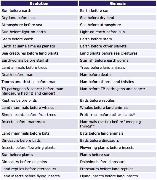 kjetil02 Skrevet 24. februar 2007 Skrevet 24. februar 2007 (endret) Kan du stole på Bibelen? Umiddelbart: Nei. Men la oss se hva du skriver. Hvis vi skal kunne stole på Bibelen, må den også være nøyaktig i vitenskapelige spørsmål. (...) Detaljene varierer, men de vesentlige elementene i den astronomiske fremstilling og den bibelske beretning i 1. Mosebok er de samme.» – 1. Mosebok 1: 1.8009427[/snapback] Fra Answer in Genesis, amerikansk young earth-menighet: "you cannot harmonize the Bible with millions of years, no matter where you try to wedge in the time into Genesis—unless you rearrange the text by moving verses and phrases around to radically change the order of events in Genesis 1. (...) The Bible clearly teaches a literal six-day creation a few thousand years ago and a global catastrophic Flood at the time of Noah. The Bible firmly resists any attempts to marry it with evolution and millions of years." Under er en skjematisk fremstilling av motsetninger mellom vitenskapen og bibelen, fra samme side. Endret 24. februar 2007 av kjetil02