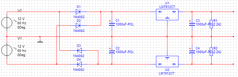 toffen89 Skrevet 18. mars 2007 Skrevet 18. mars 2007 (endret) laget en greit krets her: jeg har brukt 2 strømfrsynnger så det det blir jord. Personlig er ikke helt god med likerettere så jeg brukte 4 dioder . Jeg har brukt 7812 som gir en ganske jevn +12 volt, samme med 7912 som gir en ganske jevn -12 volt. Kondensatorene har en fin størrelse som fjerner det meste av rippel. 12_volt_DC.bmp Endret 18. mars 2007 av toffen89