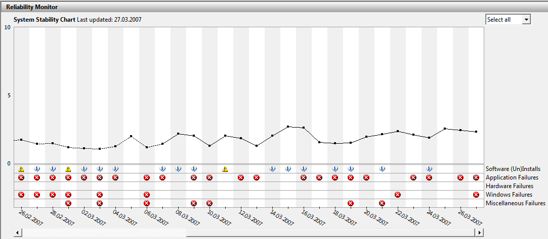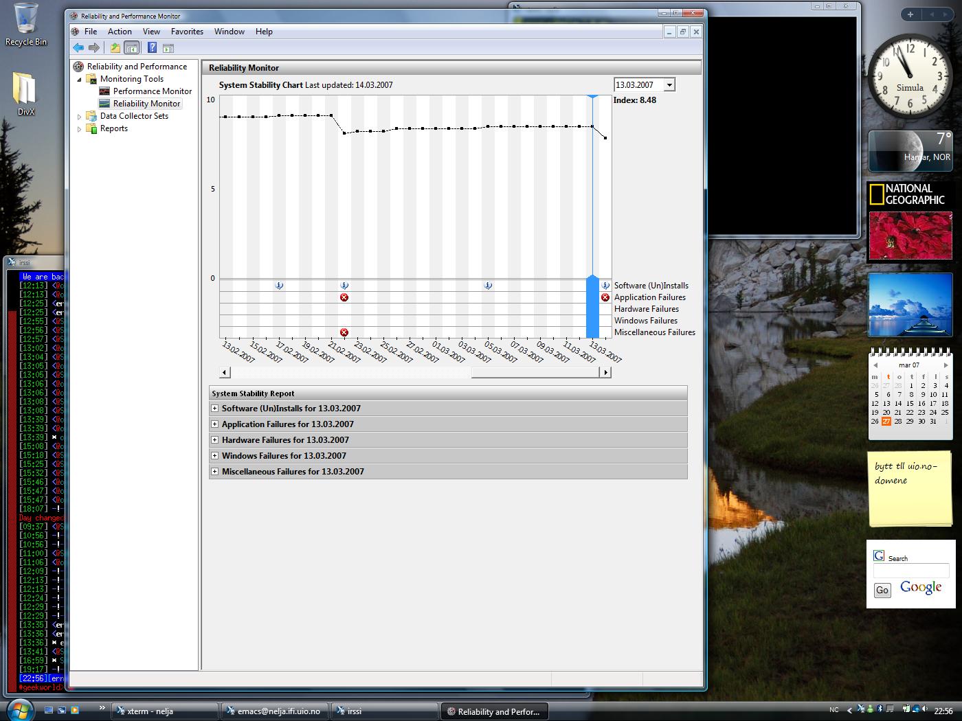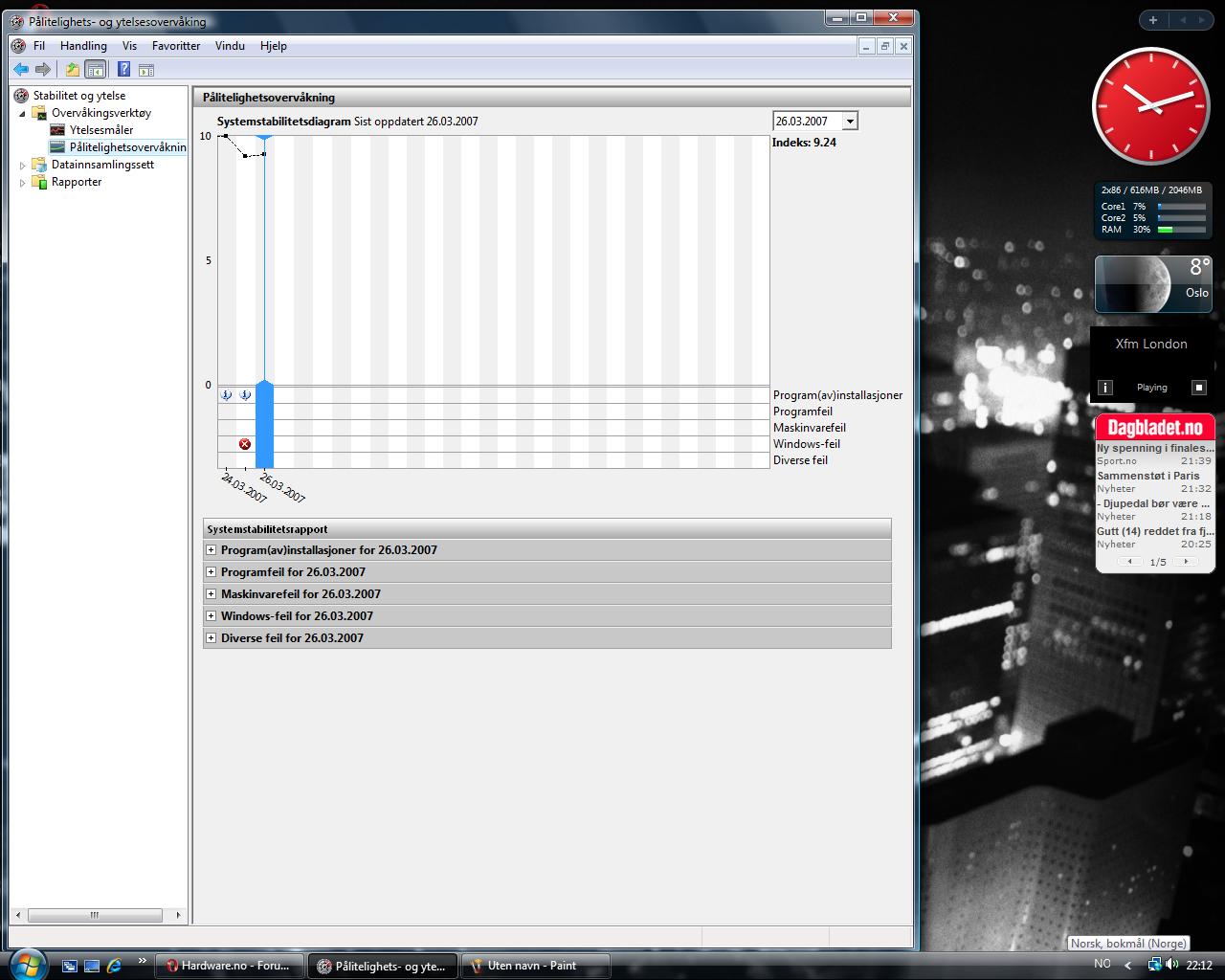 Sparboresh Skrevet 27. mars 2007 Skrevet 27. mars 2007 ...Ser bare for ett mareritt jeg har hatt når jeg har prøvd Ubuntu, Mandrake og hva enn det siste hette. Ett mareritt fra ende til annen. og jeg har nok glemt mer om ymse OS enn mange kommer til å lære. JA, jeg vet det er blærete sagt. men det er sant. 8250010[/snapback] Fy skamme seg! Komme drassende med kunnskap om mer enn ett OS er selvfølgelig ikke akseptabelt. Her er for øvrig skjermbilde av pålitelighetsmonitoren fra min Vista-maskin for å følge oppfordringen fra godeste ullevål. Maskinen har vært i bruk siden desember. Ser ut til at grafen faller litt en gang i blant uten at jeg kan si jeg helt har merket noe til at problemer skal ha oppstått