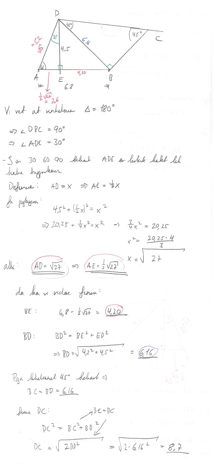 hockey500 Skrevet 28. mars 2007 Skrevet 28. mars 2007 (endret) Hmm, jeg klarer ikke løse den med 10. klasse matte, men med litt trigonometri går det greit: b) AED er en 30, 60, 90 graders trekant, så AE er halvparten av AD. da kan du finne AE som en likning: x² + 4,5² = (2x)² x² - 4x² = -4,5² -3x² = -4,5² 3x² = 4,5² x = sqrt(4,5² / 3) = 2,59807621 da har du selvsagt også lengden på AD. BE er 6,8 - AE. BD finner så deretter med pytagoras. BC = BD fordi det er 2 45-graders vinkler i den trekanten. CD finner du tilslutt igjen med pytagoras c) 1: Finn arealet av trekant ABD. her vet du høyde og lengde, så det er ikke noe problem. 2: Finner AE slik: tan(60) = 4,5/x --> x = tan(60) / 4,5 3: Finner BE slik: 6,8 - (tan(60) / 4,5) 4: Deretter kan du finne BD med pytagoras 5: Finner BC med sinussetningen: sin(45) / x = sin(45) / BD 6: finner arealet av den andre trekanten med BD * BC / 2 da har du arealet av begge trekantene, så er det bare å plusse sammen arealet. EDIT: ved nærmere ettersyn kan du selvsagt finne arealet med pytagoras læresetning også, så du kan vel egentlig glemme alt jeg har skrevet på oppgave c). huff, dette ble mye rot fra min side, men så lenge du vet at AE = 1/2 AD og BC = BD, kan alt løses med pytagoras Endret 28. mars 2007 av hockey500