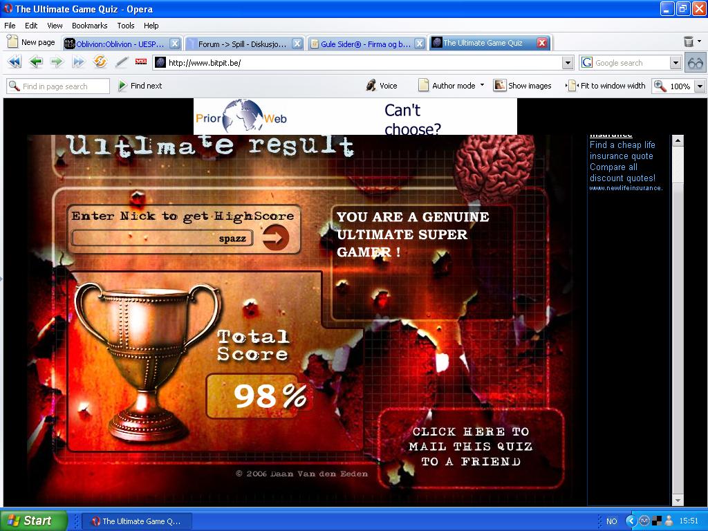 Kuroneko Skrevet 10. april 2007 Skrevet 10. april 2007 90%, konsollspørsmålene ødela en del, dessuten var jeg litt for rask på noen jeg egentlig visste. Dog, egentlig betryggende å se at jeg ikke kan absolutt alt, ville muligens vitnet om litt for mye spilling over litt for lang tid.