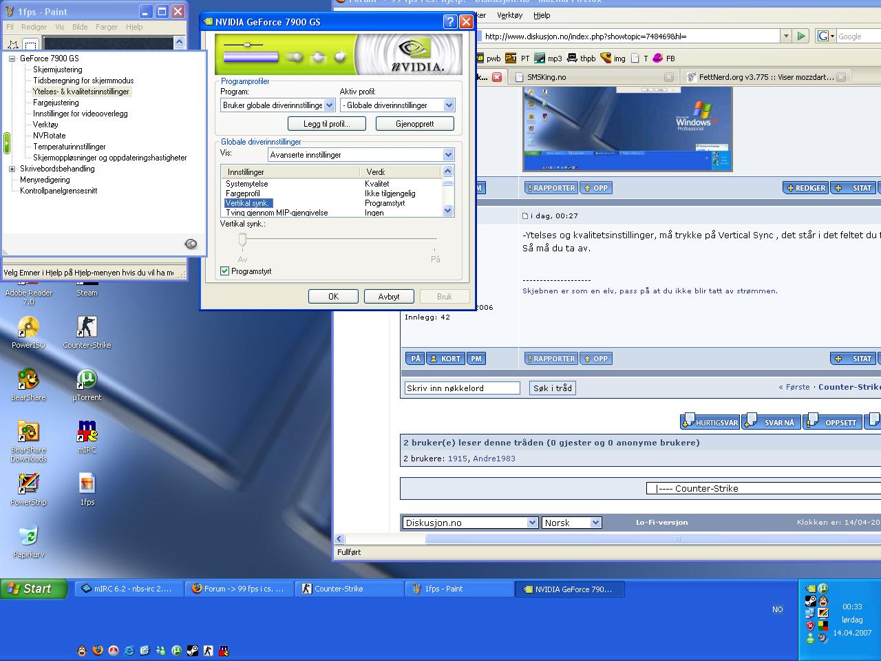 IndR Skrevet 13. april 2007 Skrevet 13. april 2007 -Ytelses og kvalitetsinstillinger, må trykke på Vertical Sync , det står i det feltet du får opp. Så må du ta av.