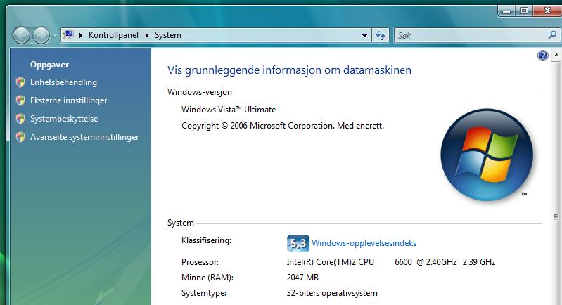 Icodden. Skrevet 17. april 2007 Skrevet 17. april 2007 (endret) Jeg har nettop lakt inn Windows Vista. Når jeg skal åpne bilder i windows fotogalleri kommer det opp at jeg har for lite ram, men jeg har jo 2048MB. Når skjermdriver ikke er innstalert fynker det, men etter jeg la inn 158.18 driveren til nvidia sluttet det å virke. Det viser også at jeg har 2047MB ram i Windows som er feil. Hva er galt? Endret 17. april 2007 av -Jon-Arne-