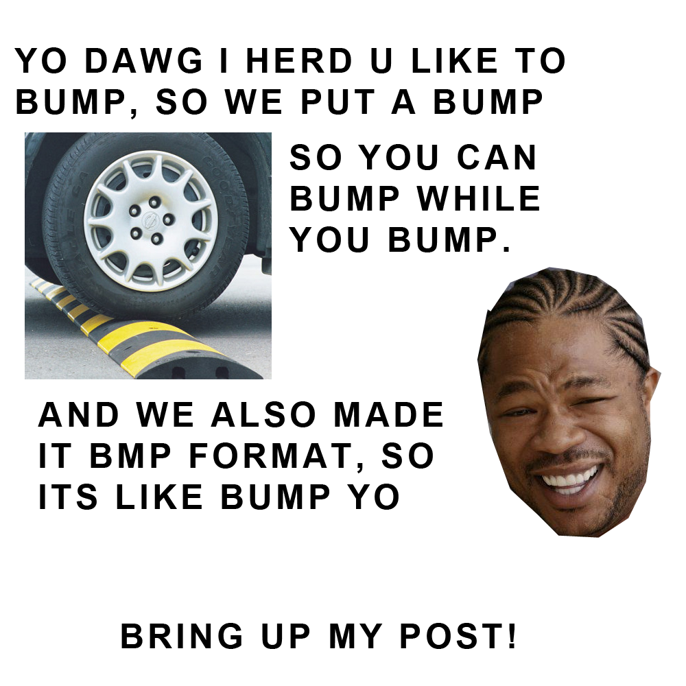 Ajaco Skrevet 29. november 2010 Skrevet 29. november 2010 (endret) Det som er teit er å bruke bmp. Pfft, bmp er fremtiden! Jeg lagde kanskje tidenes dårligste yo dawg. bump.bmp (Ja, det skal være .bmp - det er en del av vitsen. Hvis du er for lat, sjekk spoiler, og lat som om det er BMP) Fyfaen, typo også. HAHA. Skulle være: YO DAWG I HERD U LIKE TO BUMP SO WE PUT A BUMP IN YOUR BUMP SO YOU CAN BUMP WHILE YOU BUMP. Hvis du kun lastet ned .bmp-fila, sjekk spoileren for typofix. Endret 29. november 2010 av Ajaco 2