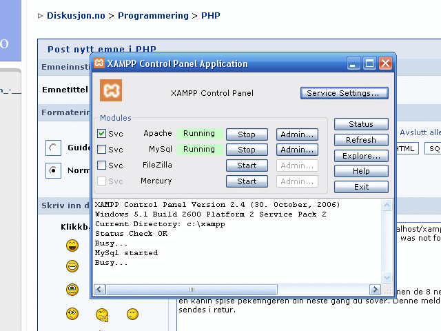 Rescue me Skrevet 24. mai 2007 Skrevet 24. mai 2007 Har innstalert XAMPP nå, men når jeg åpner "http://localhost/xampp" kommer det bare opp denne meldingen "The requested URL /xampp was not found on this server." Screen shot av XAMPP kontrollpanel: