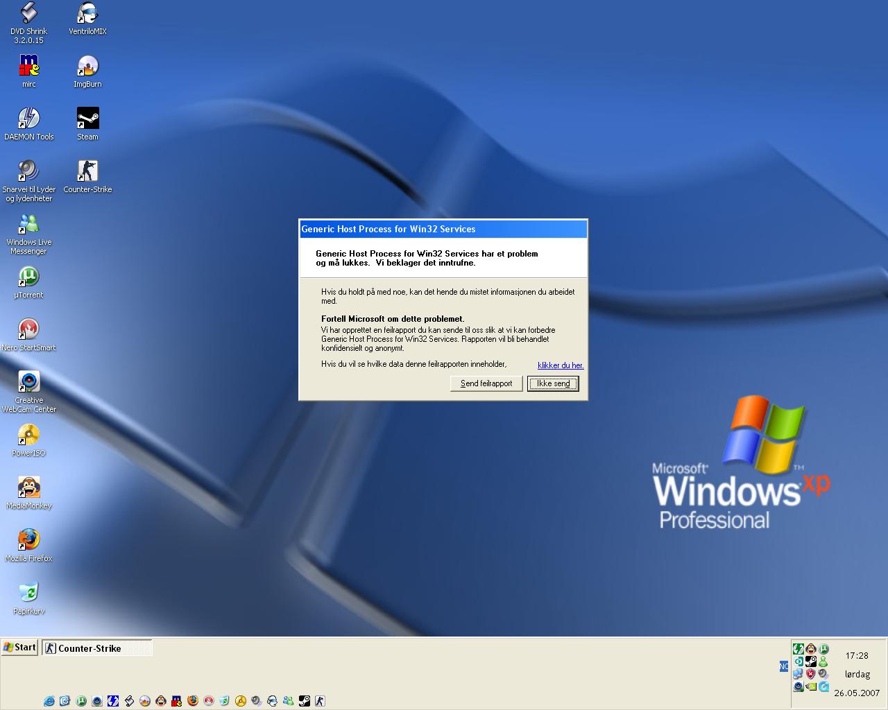 1915 Skrevet 26. mai 2007 Skrevet 26. mai 2007 (endret) jeg formaterte pcn. pga den bytta hele tiden til windows 2000 skin. men det hjalp ikke. etter jeg formaterte og la inn windows så er det xp style. etter en stund så blir det windows 2000? og det er umulig å bytte tilbake til xp skin. noen ide? og så kommer dettte (Se bildet) + at det lager når jeg spiller cs :S hva kan være galt? noen som har noen ideer? takker for alle gode svar Endret 26. mai 2007 av 1915