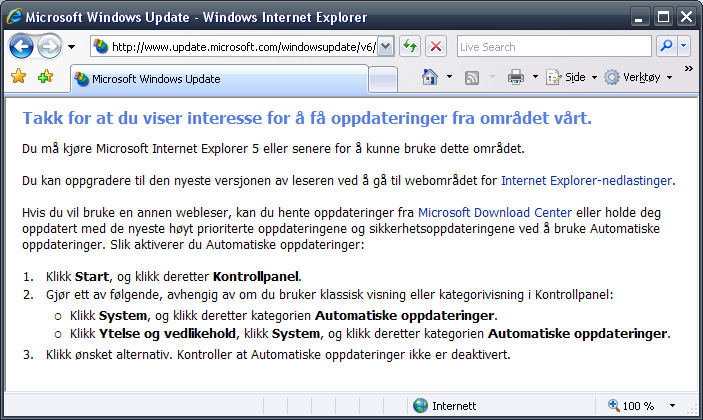 Win Update i IE7.. Får feil: Du må ha IE5 el.nyere