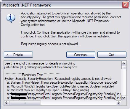 AnaXyd Skrevet 20. juni 2007 Forfatter Skrevet 20. juni 2007 (endret) For å være på den sikre siden... Denne kan på ingen måte slette noe annet i registeret? Er dumt å.. Ja... Og: Denne: DangerKeys.Add("[farlig nøkkel her]", "") Jeg skal ikke ha med klammene [ og ] ikkesant? Hvis nøkkelen i registeret som er farlig, f.eks heter dorull så skal det være slik som dette?: DangerKeys.Add("dorull", "") Og enda en ting: Vet du hvordan jeg får åpnet Search & Destroy spyware filene? Det er filtyper som .sbi og .sbs. Har lastet ned de ja... Og jeg har også søkt google rundt for å finne noe som kunne konvertere dette til noe annet... ENDA en ting: Har nå testet funksjonen, men det kom opp en error: Hva som står i erroren: See the end of this message for details on invoking just-in-time (JIT) debugging instead of this dialog box. ************** Exception Text ************** System.Security.SecurityException: Requested registry access is not allowed. at System.ThrowHelper.ThrowSecurityException(ExceptionResource resource) at Microsoft.Win32.RegistryKey.OpenSubKey(String name, Boolean writable) at Microsoft.Win32.RegistryKey.OpenSubKey(String name) at **fjernet**AntispywareBeta1.regsch.ProcessRegistry(RegistryKey StartKey) in C:\Documents and Settings\**fjernet**\Mine dokumenter\Visual Studio 2005\Projects\**fjernet** Antispyware Beta 1\**fjernet** Antispyware Beta 1\regsch.vb:line 43 at **fjernet**AntispywareBeta1.regsch.ProcessRegistry(RegistryKey StartKey) in C:\Documents and Settings\**fjernet**\Mine dokumenter\Visual Studio 2005\Projects\**fjernet** Antispyware Beta 1\**fjernet** Antispyware Beta 1\regsch.vb:line 46 at **fjernet**AntispywareBeta1.regsch.btnFixRegistry_Click(Object sender, EventArgs e) in C:\Documents and Settings\**fjernet**\Mine dokumenter\Visual Studio 2005\Projects\**fjernet*** Antispyware Beta 1\***fjernet*** Antispyware Beta 1\regsch.vb:line 18 at System.Windows.Forms.Control.OnClick(EventArgs e) at System.Windows.Forms.Button.OnClick(EventArgs e) at System.Windows.Forms.Button.OnMouseUp(MouseEventArgs mevent) at System.Windows.Forms.Control.WmMouseUp(Message& m, MouseButtons button, Int32 clicks) at System.Windows.Forms.Control.WndProc(Message& m) at System.Windows.Forms.ButtonBase.WndProc(Message& m) at System.Windows.Forms.Button.WndProc(Message& m) at System.Windows.Forms.Control.ControlNativeWindow.OnMessage(Message& m) at System.Windows.Forms.Control.ControlNativeWindow.WndProc(Message& m) at System.Windows.Forms.NativeWindow.Callback(IntPtr hWnd, Int32 msg, IntPtr wparam, IntPtr lparam) The Zone of the assembly that failed was: MyComputer ************** Loaded Assemblies ************** mscorlib Assembly Version: 2.0.0.0 Win32 Version: 2.0.50727.42 (RTM.050727-4200) CodeBase: file:///C:/WINDOWS/Microsoft.NET/Framework/v2.0.50727/mscorlib.dll ---------------------------------------- **fjernet*** Antispyware Beta 1 Assembly Version: 1.0.0.0 Win32 Version: 1.0.0.0 CodeBase: file:///C:/Documents%20and%20Settings/***fjernet****/Mine%20dokumenter/Visual%20Studio%202005/Projects/**fjernet***%20Antispyware%20Beta%201/***fjernet**%20Antispyware%20Beta%201/bin/Release/***fjernet***%20Antispyware%20Beta%201.exe ---------------------------------------- Microsoft.VisualBasic Assembly Version: 8.0.0.0 Win32 Version: 8.0.50727.42 (RTM.050727-4200) CodeBase: file:///C:/WINDOWS/assembly/GAC_MSIL/Microsoft.VisualBasic/8.0.0.0__b03f5f7f11d50a3a/Microsoft.VisualBasic.dll ---------------------------------------- System Assembly Version: 2.0.0.0 Win32 Version: 2.0.50727.42 (RTM.050727-4200) CodeBase: file:///C:/WINDOWS/assembly/GAC_MSIL/System/2.0.0.0__b77a5c561934e089/System.dll ---------------------------------------- System.Windows.Forms Assembly Version: 2.0.0.0 Win32 Version: 2.0.50727.42 (RTM.050727-4200) CodeBase: file:///C:/WINDOWS/assembly/GAC_MSIL/System.Windows.Forms/2.0.0.0__b77a5c561934e089/System.Windows.Forms.dll ---------------------------------------- System.Drawing Assembly Version: 2.0.0.0 Win32 Version: 2.0.50727.42 (RTM.050727-4200) CodeBase: file:///C:/WINDOWS/assembly/GAC_MSIL/System.Drawing/2.0.0.0__b03f5f7f11d50a3a/System.Drawing.dll ---------------------------------------- System.Configuration Assembly Version: 2.0.0.0 Win32 Version: 2.0.50727.42 (RTM.050727-4200) CodeBase: file:///C:/WINDOWS/assembly/GAC_MSIL/System.Configuration/2.0.0.0__b03f5f7f11d50a3a/System.Configuration.dll ---------------------------------------- System.Xml Assembly Version: 2.0.0.0 Win32 Version: 2.0.50727.42 (RTM.050727-4200) CodeBase: file:///C:/WINDOWS/assembly/GAC_MSIL/System.Xml/2.0.0.0__b77a5c561934e089/System.Xml.dll ---------------------------------------- System.Runtime.Remoting Assembly Version: 2.0.0.0 Win32 Version: 2.0.50727.42 (RTM.050727-4200) CodeBase: file:///C:/WINDOWS/assembly/GAC_MSIL/System.Runtime.Remoting/2.0.0.0__b77a5c561934e089/System.Runtime.Remoting.dll ---------------------------------------- ************** JIT Debugging ************** To enable just-in-time (JIT) debugging, the .config file for this application or computer (machine.config) must have the jitDebugging value set in the system.windows.forms section. The application must also be compiled with debugging enabled. For example: <configuration> <system.windows.forms jitDebugging="true" /> </configuration> When JIT debugging is enabled, any unhandled exception will be sent to the JIT debugger registered on the computer rather than be handled by this dialog box. Hva er galt? Trenger jeg å gi programmet tilgang til noe? Endret 20. juni 2007 av AnaXyd
