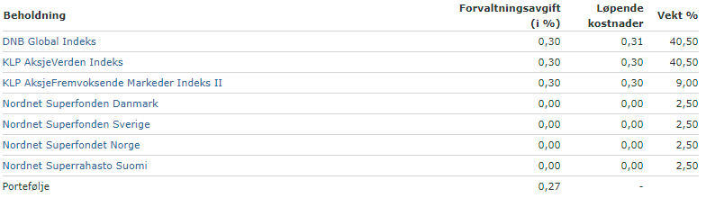 Frank Drebin Skrevet 28. oktober 2017 Skrevet 28. oktober 2017 Kjenner ikke så godt til KLP AGI V og DNB GI, men jeg tipper at de er veldig like. Det ser ut til at DNB følger MSCI World-indeksen, mens KLP sitt følger en egen modifisert versjon av MSCI World Index Developed Markets: KLP WRLD NOK er en global aksjeindeks, som på daglig basis kalkuleres av MSCI, på oppdrag for KLP. For å kalkulere indeksen tar MSCI utgangspunkt i MSCI World Index Developed Markets og ekskluderer de selskapene som ikke tilfredsstiller KLPs etiske minstekrav. Listen over selskaper som ekskluderes oppdateres to ganger pr år. MSCI har ingen rolle i å utvikle, gjennomgå eller godkjenne KLPs etiske investeringskriteria.