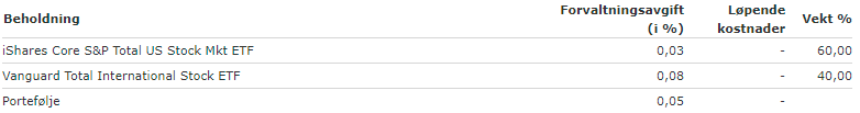 Frank Drebin Skrevet 28. oktober 2017 Skrevet 28. oktober 2017 Ja, du får i så fall ned totalkostnaden fra 0,30 % til 0,27 %. Er det i aksjesparekonto du har disse? I så fall er det vel nesten så lavt du kommer. Kan eventuelt bytte DNB Global Indeks til KLP AksjeGlobal Indeks V, som har 0,20 % i årlig kostnad. Da er du nede i 0,23 % totalt for porteføljen. Hvis du har disse fondene et annet sted, f.eks. på Zero, så kan du få totalkostnad ned i 0,05 % ved å kombinere to ETFer. 60 % ITOT og 40 % VXUS.