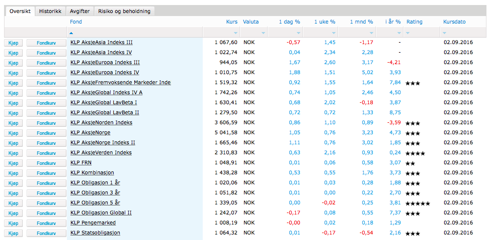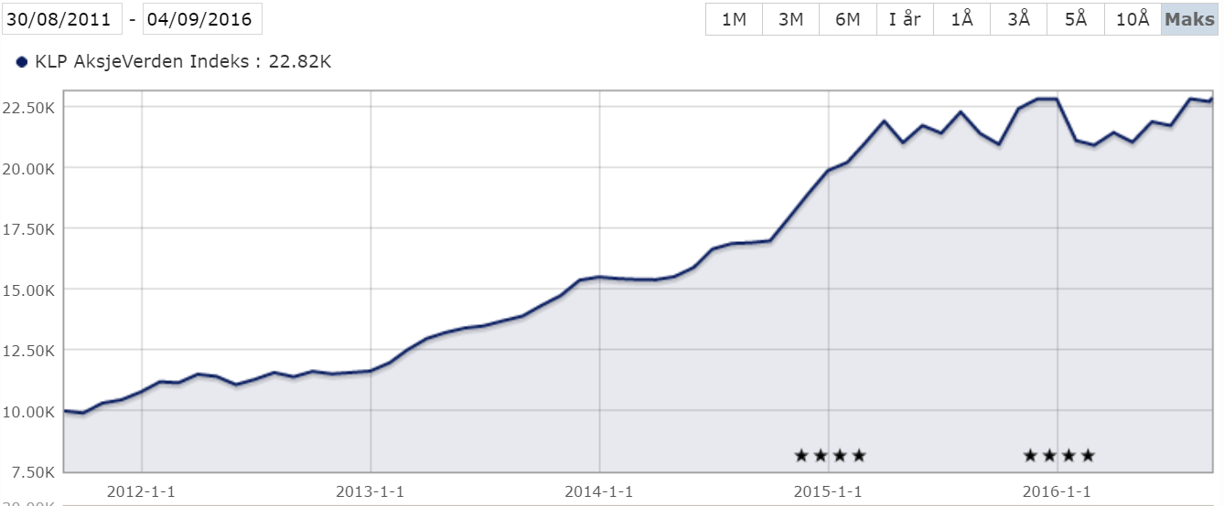 Twinflower Skrevet 6. september 2016 Skrevet 6. september 2016 (endret) Jeg får inn 500k fra salg av bolig som jeg planlegger å plassere i indeksfond via Nordnet, for eksempel KLPs fond. Hvilke fond bør jeg spre beløpet over? Hvordan bør jeg spre inngangen? Under er en liste over tilgjengelige KLP-fond fra Nordnet. KLP AksjeAsia Indeks III KLP AksjeAsia Indeks IV KLP AksjeEuropa Indeks III KLP AksjeEuropa Indeks IV KLP AksjeFremvoksende Markeder Indeks II KLP AksjeGlobal Indeks IV A KLP AksjeGlobal LavBeta I KLP AksjeGlobal LavBeta II KLP AksjeNorden Indeks KLP AksjeNorge KLP AksjeNorge Indeks II KLP AksjeVerden Indeks edit: la til screenshot med mer info om hvert fond Endret 6. september 2016 av Twinflower