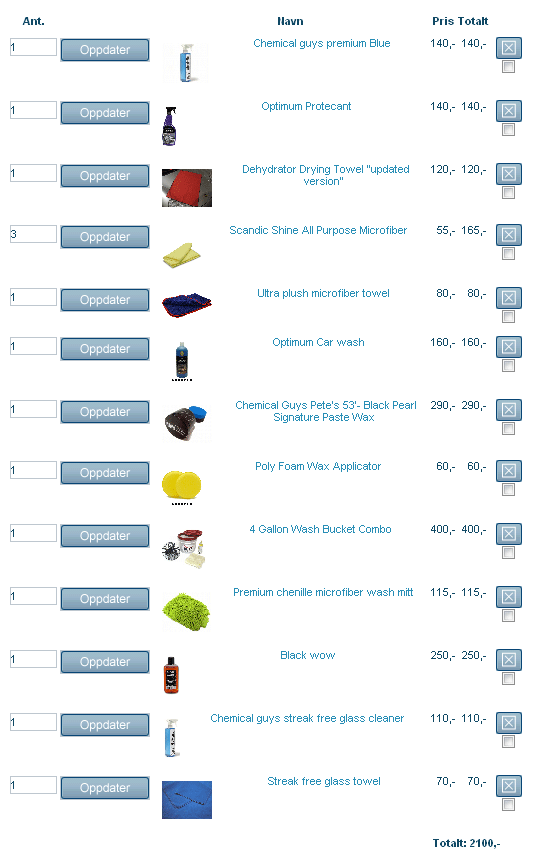 Chris_lox Skrevet 11. juni 2008 Skrevet 11. juni 2008 Hei! Skal vaske og vokse bilen min. Samtidig skal jeg gjøre listene sorte igjen og shine interiøret. Har satt opp en handleliste nå, hvor jeg mener det meste skal være som det bør, men lurer på om jeg har fått med alt! Noen som gidder å se over for å sjekke at jeg har det jeg trenger, eventuelt noe jeg bør bytte ut? Chris