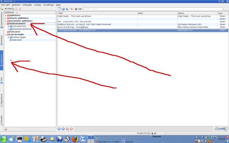 JohnsonsWhatever Skrevet 9. juli 2007 Forfatter Skrevet 9. juli 2007 sjekk hvilken versjon av amarok du har.ifra 1.4.5 er det støtte for shoutcast. er vel det du hadde i winamp tenker jeg. oppgraderte selv amarok akkurat nå og jammen dukket det opp mange nye radiokanaler. hvor oppdatert amarok pakkene er til ubuntu vet jeg ikke. 9036855[/snapback] Jeg har 1.4.6 men hvordan finner jeg kanalene da? *Forvirra* 9036971[/snapback] under spillelister|radiostrømmer|shoutcast la ved ett bilde og. 9037481[/snapback] Nå ble jeg flau! Tusen takk for hjelpa, det var egentlig enkelt og finne hvis jeg bare brukte den baren som sto på venstre side, hehe.