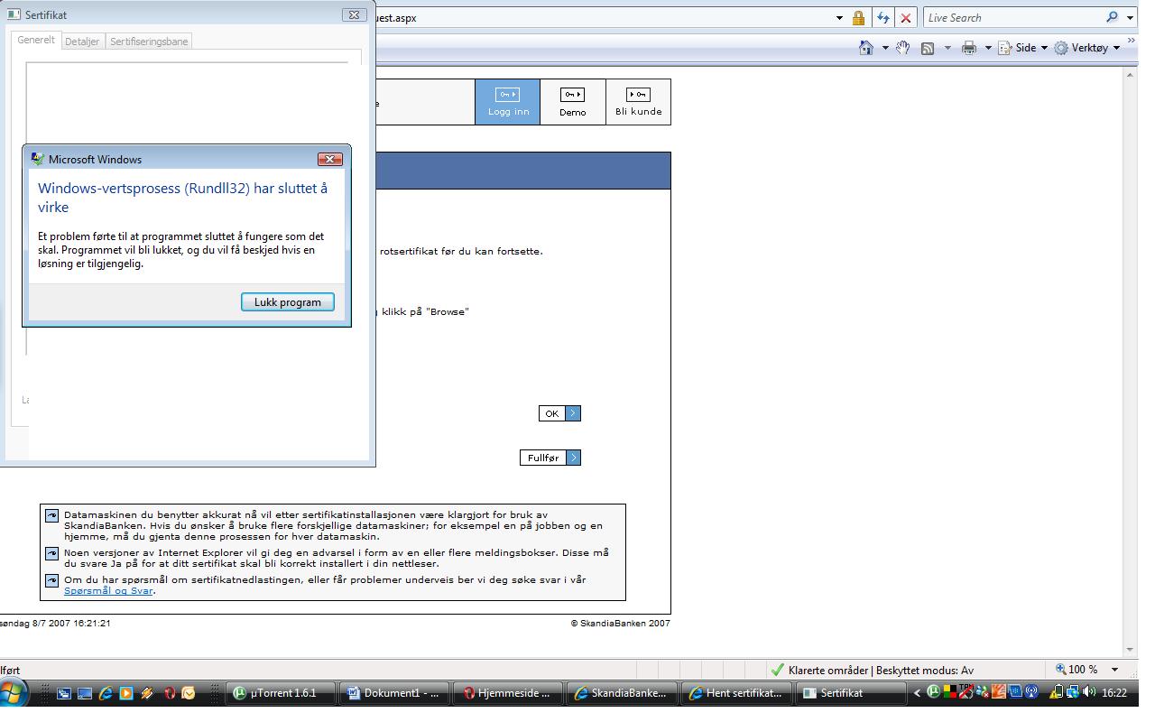 Tanus Skrevet 12. juli 2007 Skrevet 12. juli 2007 (endret) Hei, Jeg kjøpte meg nettopp en ny PC med MS Vista business. På denne PCen har jeg installert datax (et regnskapsprogram som bruker explorer til å hente informasjon fra skandiabanken). For å bruke skandiabanken må en installere et sertifikat, noe jeg ikke får gjort pga. at jeg får opp følgende feilmelding: . Jeg har vært i dialog med skandiabanken, de har forklart at jeg må skru av DEP (Data execution prevention) Dette har jeg gjort, men får fortsatt ikke rundll32 til å fungere. Er det noen som har vært borti tilsvarende problem, og har litt mer peiling på dette en "brukerservice@skandiabanken"? På forhånd takk! Hilsen Tanus Endret 12. juli 2007 av Tanus