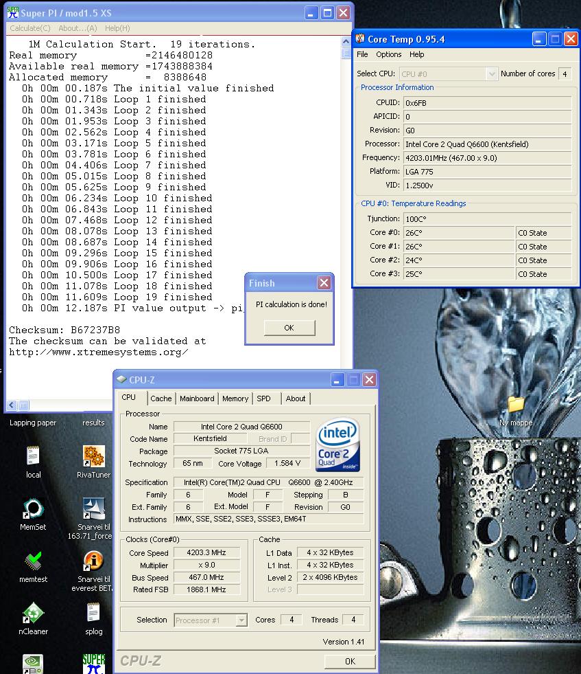 tiigem Skrevet 18. november 2007 Skrevet 18. november 2007 testa prime i natt på min Q6600, kjører 415 fsb på 1,456 v Asus P5K premium 4 x Ballistix 8500 Noctua UH12 med 2 x 12 cm noctua