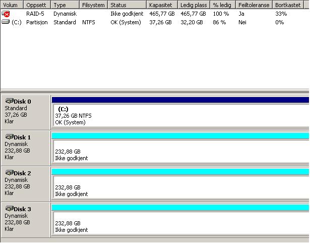 Makky Skrevet 17. august 2007 Skrevet 17. august 2007 Har reinstallert win etter et hovedkort bytte. Men får ikke igang software-raidet i XP igjen. Har et software-raid 5. Volumet har status: Ikke godkjent Høyreklikker jeg på volumet, er eneste valg "slett volum" Høyreklikker jeg på diskene, kan jeg velge "reaktiver disk", men dette hjelper ikke. Legger ved et bilde av diskbehandling. Hva må jeg gjøre for å få aktiver raidet igjen? Bruker et promise 4 porters sata-kort (uten raid).