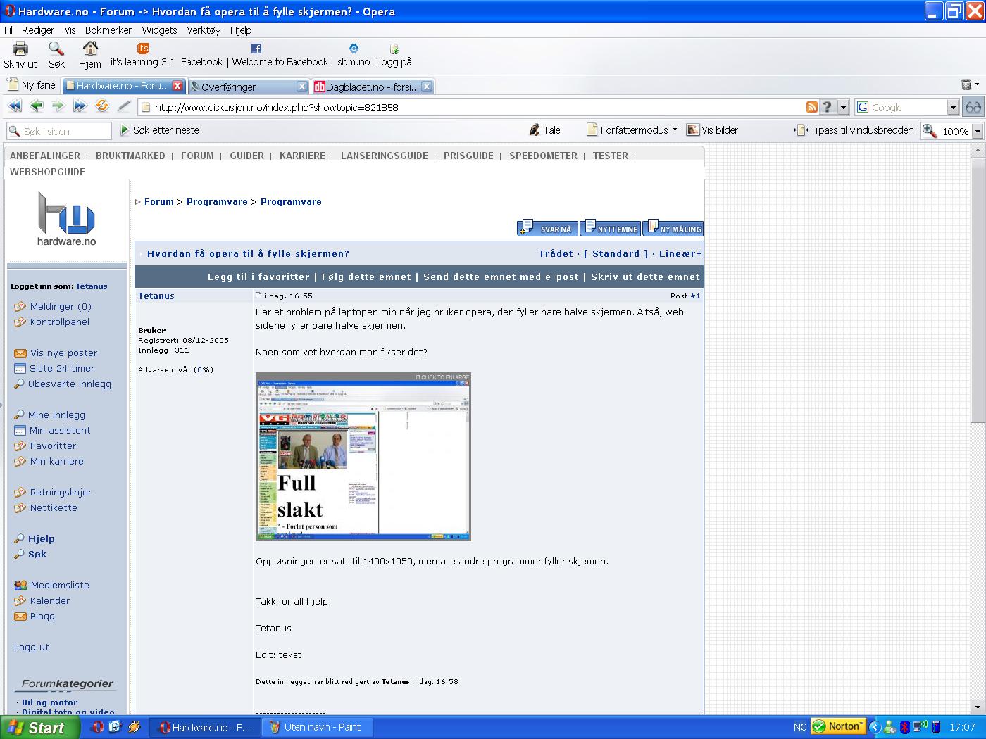 Tetanus Skrevet 29. august 2007 Skrevet 29. august 2007 (endret) Har et problem på laptopen min når jeg bruker opera, den fyller bare halve skjermen. Altså, web sidene fyller bare halve skjermen. Noen som vet hvordan man fikser det? Oppløsningen er satt til 1400x1050, men alle andre programmer fyller skjemen. Takk for all hjelp! Tetanus Edit: tekst Endret 29. august 2007 av Tetanus