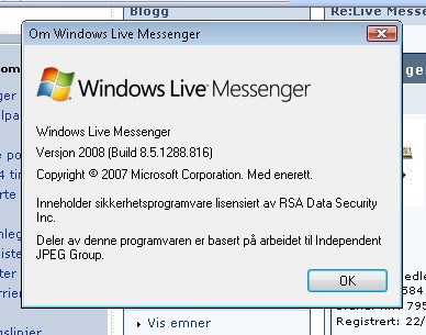 RamGuy Skrevet 6. september 2007 Skrevet 6. september 2007 wlm 8.5 er med i pakken =) No trur eg eg forstår. Dette er bare for Windows Vista. 9438318[/snapback] Nei. Windows Live Messenger 8.5 BETA2 Kjør den installasjonen, den er ferdig innstilt for å installere WLM8.5, men du kan selvfølgelig velge andre deler av Live-Pakken også. Kjør installasjonen, og du skjønner det nok Og ja, disse installasjonene krever internett-oppkobling, siden du velger hvilke produkter som skal installeres i installasjons-prosessen, også lastes de valgte programmene ned. Det er derfor installasjonsfilen er såpass liten Mess Patch for Windows Live Messenger 8.5 BETA2 Messenger Plus! Live for Windows Live Messenger 8.5 BETA2 EDIT: Her er en "standalone-installasjon" for Windows Live Messenger 8.5 BETA2. Altså kun Live Messenger, og ikke noe av det andre i Live-Pakken. Krever heller ikke internett-oppkobling under installasjon EDIT: Fjernet "standalone" linken, siden Microsoft har byttet linken fra Windows Live Messenger 8.5 BETA2, tilbake til BETA1 igjen.. 9438480[/snapback] Ser ikke så mye beta ut for meg da men 9438676[/snapback] Det er fult mulig. Men de sies overalt på nettet at det er BETA2. Og at fullversjonen skal komme med 64-bit støtte, noe som denne versjonen ikke har