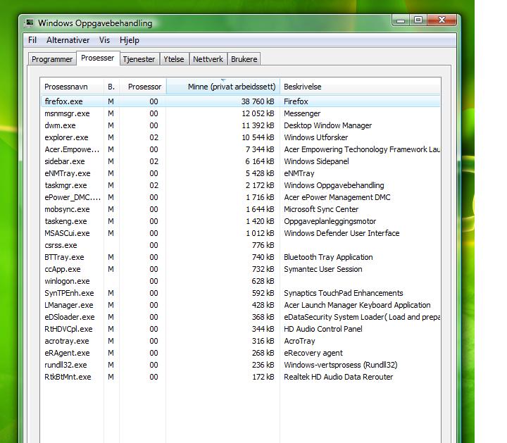 simson Skrevet 14. september 2007 Skrevet 14. september 2007 Hei! Har du oppdatert windowsen med alle nødvendige oppdateringer? Bør sjekke hva prosesser som bruker hva, som de sier ovenfor her. Siden pc'en har vært treg hele tiden så hadde jeg begynt å lure på om det var hardware relatert. Har du sjekket at prosessoren er på "max ytelse" ? At den ikke er stilt ned for mindre varme/bedre batteritid? 9484379[/snapback] Ja det har egentlig alltid vært treg... Men nå er den ekstremt treg. Ja, har den på høyeste ytelse:) 9485677[/snapback] Monica, gjør følgende: 1. Trykk ctrl+alt+delete (samtidig) 2. Trykk oppgavebehandling. 3. Velg fanen prosesser Du får da opp en liste over alle programmer som bruker av minnet. Hvis du i tillegg trykker på "Bruk av minne", får du sortert de etter hvilke som bruker størst minne. Du kan deretter enten skrive av listen og poste den her, eller trykke Print Screen, og deretter gå inn i Photoshop/Paint, og laste bildet inn i forumet. Det blir da lettere for folka på forumet å se om du har mange unødvendige programmer, som du kan disable eller avinstallere.