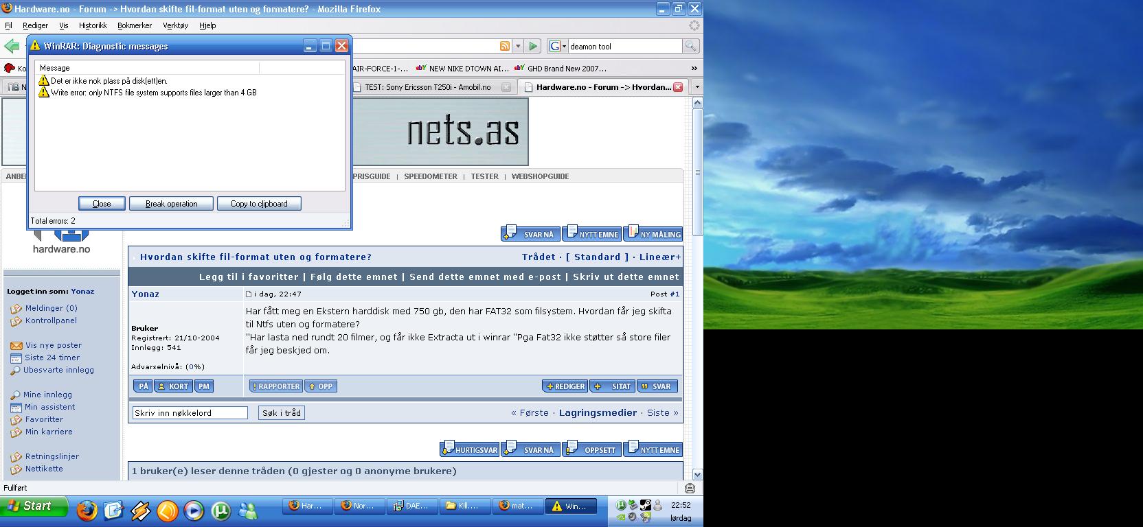 Yonaz Skrevet 14. september 2007 Skrevet 14. september 2007 (endret) Har fått meg en Ekstern harddisk med 750 gb, den har FAT32 som filsystem. Hvordan får jeg skifta til Ntfs uten og formatere? "Har lasta ned rundt 20 filmer, og får ikke Extracta ut i winrar "Pga Fat32 ikke støtter så store filer får jeg beskjed om. Endret 14. september 2007 av Yonaz