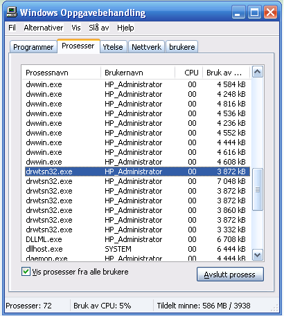 Sleuth Skrevet 21. september 2007 Skrevet 21. september 2007 Har et lite problem..... når jeg gjør hva som helst på PC-en kommer det en haug med dwwin og drwtsn32 opp i oppgavebehandling (se vedlegg) , og jeg aner ikke hvorfor, men alle programmene som jeg har oppe klikker en etter en Uten_navn.bmp