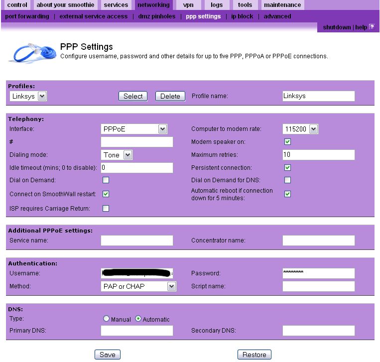 tingo Skrevet 27. september 2007 Skrevet 27. september 2007 Rød - PPPoE er korrekt, hvertfall i forhold til smoothwall sitt forum. Hmm, jeg lurer litt på det. Jeg tok en kikk på installasjonsveiledningen til SmoothWall Express, og den sier ihvertfall at ADSL kun skal brukes dersom du har et ADSL-modem i maskina di, evt. koblet til med usb. Dersom det kommer Ethernet ut av ADSL-modemet ditt, så skal du bruke "internett" istedet. Hvilken versjon av Smoothwall er det du bruker? Ja, ifølge speedtouch så var det koblet opp med PPPoE før jeg satt det i bridge, er jo tilbake som vanlig modem/router nå og jeg ser nå at det fremdeles er PPPoE. 9588381[/snapback] Ok, hva sier 'pppoe iflist' (evt. bare 'ppp iflist') fra kommando-linja på Speedtouch'en nå da?