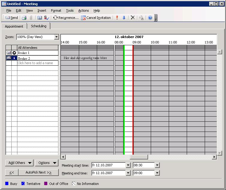 Kenny Bones Skrevet 12. oktober 2007 Skrevet 12. oktober 2007 (endret) Hei! Sliter litt med en bruker her. Tidligere fikk jeg beskjed om at når brukere skal lage møteinnkallelse i Outlook så vistes kalenderen til én bruker bare hvite felt skravert med sorte streker. No information. Så jeg fikk han til å kjøre "outlook.exe /cleanfreebusy". Dette fungerte delvis. Det vil si, nå er det ikke skraverte felt lenger, men helt grå felt. Som om brukeren er ledig hele tiden. Noe han definitivt ikke er! Men det som er litt rart er at jeg kan vise hans kalender via kalenderen min i Outlook og da vises alt riktig. Men bare ikke under møteinnkallelser! Når jeg høyreklikker på kalenderen hans i min kalender så kan jeg sjekke properties. Da står det at mine rettigheter er "reviewer". Dette er vel riktig? Iogmed at jeg faktisk får til å se møtene han har på selve kalenderen, bare ikke under møteinnkallelser? Noen som har peil? Endret 15. oktober 2007 av Kenny Bones