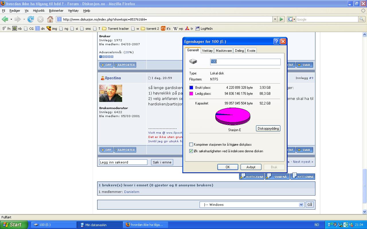 men så er det 1 harddisk i PC-en. 120 gb. så delte jeg opp slik at jeg har 20 til windows og resten til stuff.
