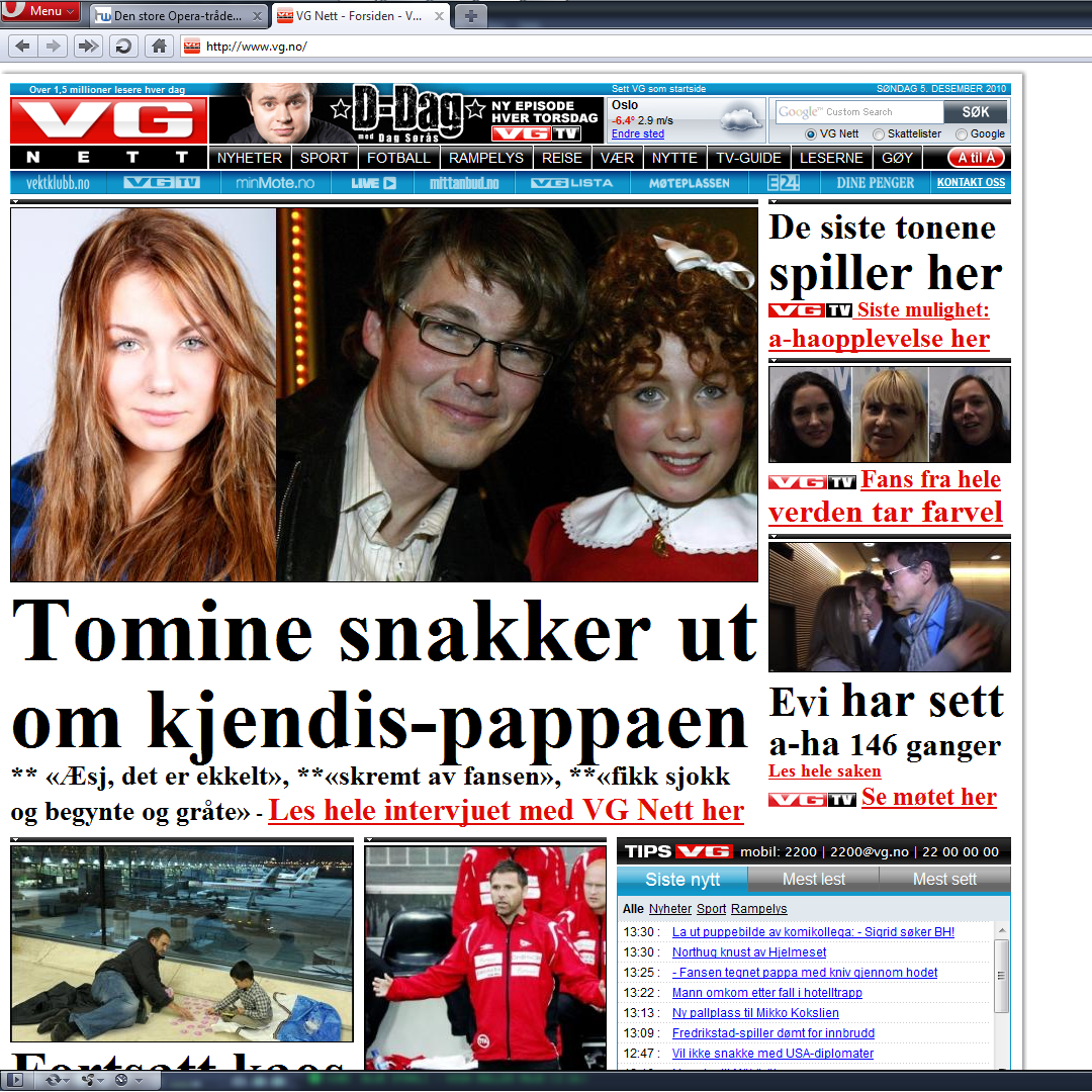 Superparanoid Skrevet 5. desember 2010 Skrevet 5. desember 2010 Vel jeg har nå enda flere screenshots å vise, men etter at jeg til slutt klarte å lagre tidligere nevnte filer på riktig plass, henger Opera seg hver gang jeg forsøker å legge til et vedlegg. Kan jo nevne da at de hvite boksene forsvant etter endringene jeg gjorde, men hele spalten på høyre side på vg.no forsvant også - trodde jeg - helt til jeg scrollet meg videre nedover på siden. Da kommer den forsvunnede spalten helt til slutt. Vanskelig å forklare, så skulle vist det med screenshots, men det nytter jo ikke lenger nå siden Opera henger seg hver gang jeg forsøker å legge til et vedlegg. Så istedenfor å bli mer overbevist om at Opera er den rette nettleseren, har jeg bare blitt mer og mer overbevist om det motsatte iløpet av de siste innleggene. Det er jo helt håpløst!