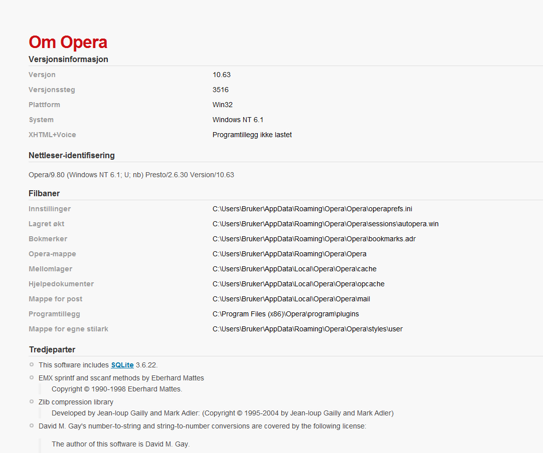 trygveaa Skrevet 4. desember 2010 Skrevet 4. desember 2010 Siden jeg har Opera på engelsk og du har den på norsk må du selvfølgelig oversette "Opera directory" til norsk, som da blir "Opera-mappe" som du kan se på bildet, dvs. C:\Users\Bruker\AppData\Roaming\Opera\Opera. Den hvite flekken er en nedoverpil som de som lagde diskusjon.no har putta der for å vise at det er en nedtrekksmeny. Når man har litt kortere nick enn du har vises den til høyre for nicket.