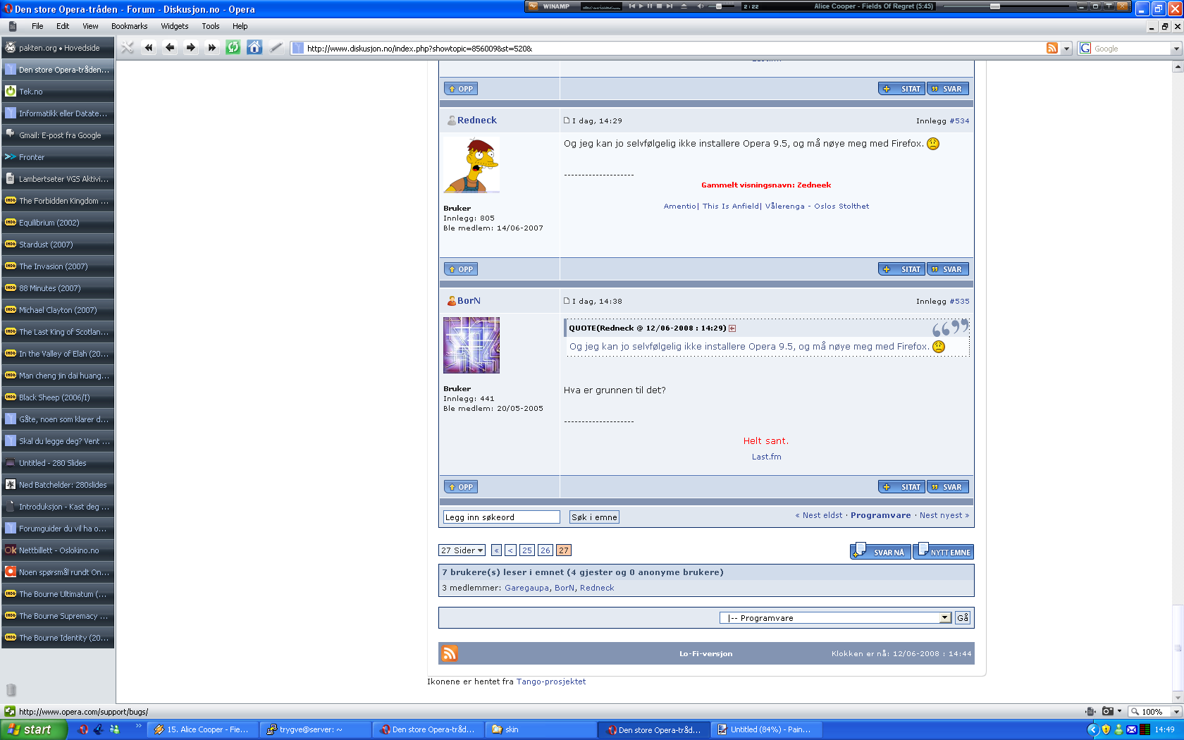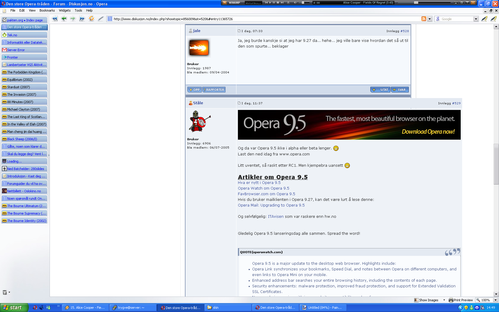 BorN Skrevet 12. juni 2008 Skrevet 12. juni 2008 (endret) Fullversjonen av Opera 9.5 er ute ja Enten så er det placebo-effekten, eller så synes jeg at scrollinga går vesentlig raskere i 9.50 enn i 9.27. Likte at fanene i det nye skinnet i 9.50 er høyere. Dette bidrar til: - Mindre sjanse for å trykke på den røde X-knappen - Større sjanse for å treffe fanene (siden de er større) hvis du skulle være rask med musa. - 9.27 med sitt standard-skin 9.50 med nytt standard-skin. Endret 12. juni 2008 av BorN