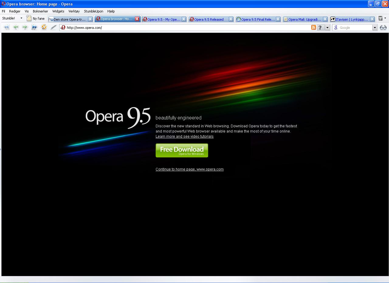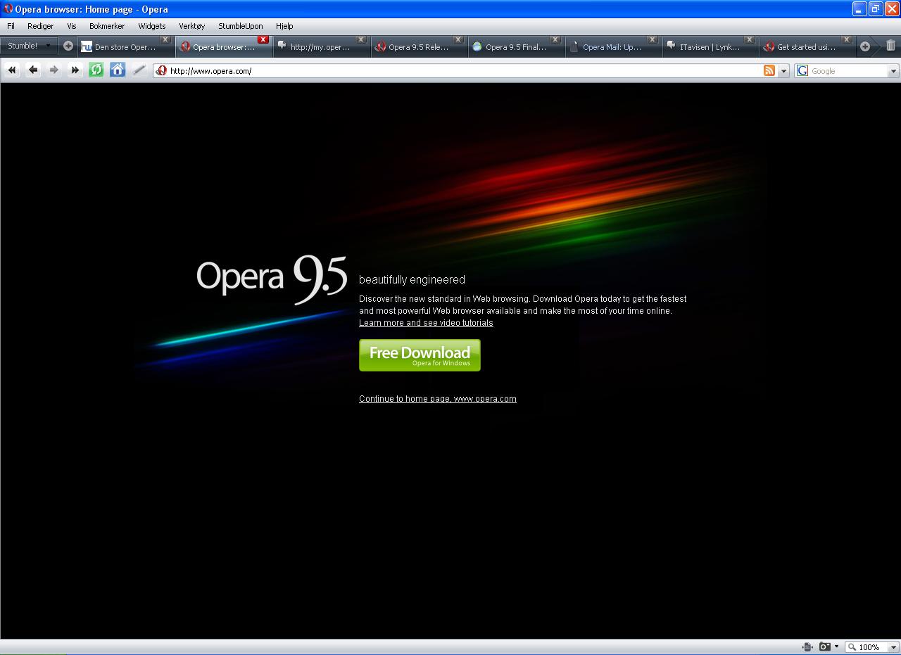 Ståle Skrevet 12. juni 2008 Forfatter Skrevet 12. juni 2008 (endret) Og da var Opera 9.5 ikke i alpha eller beta lenger. Last den ned idag fra www.opera.com Litt uventet, så raskt etter RC1. Men kjempebra uansett Artikler om Opera 9.5 Hva er nytt i Opera 9.5 Opera Watch om Opera 9.5 FavBrowser.com om Opera 9.5 Hvis du bruker mailklienten i Opera 9.27, kan det være lurt å lese denne: Opera Mail: Upgrading to Opera 9.5 Og selvfølgelig: ITAvisen som var raskere enn hw.no Gledelig Opera 9.5 lanseringsdag alle sammen. Spread the word! Opera 9.5 is a major update to the desktop web browser. Highlights include: Opera Link synchronizes your bookmarks, Speed Dial, and notes between Opera on different computers, and even links to Opera Mini on your mobile. Enhanced address bar searches your entire browsing history, including the contents of each page. Security enhancements: malware protection, improved fraud protection, and support for Extended Validation SSL Certificates. New rendering engine with improved site compatibility and performance. Opera Dragonfly, the long-awaited tools for web developers. New skin inspired by Scandinavian design. Edit; Lagt til hvordan man går fra 9.5 beta til 9.5 uten å miste instillinger i førsteposten. Endret 12. juni 2008 av Ståle