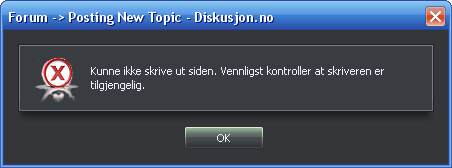 m0g1e Skrevet 3. desember 2007 Skrevet 3. desember 2007 Merker dette hver gang jeg prøver å skrive ut noe som jeg har merket av i nettleseren. Det går for det samme om det er en nettverk, PDF eller lokal skriver. Her er feilmeldingen rett fram: (helt uinteressant selvsagt..) Regner med det finnes Opera-brukere der ut som også har irritert seg grønn over dette. Flott med tilbakemeldinger..