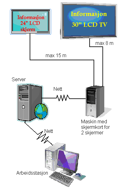 Bjek Skrevet 7. desember 2007 Skrevet 7. desember 2007 Har fått i oppdrag av min arbeidsgiver å få til to informasjonsskjermer. Skjermene skal henges på vegg i to forskjellige rom og det skal vises ulik informasjon på skjermene. Det var planlagt å bruke PowerPoint presenentasjonsfiler, men det viser seg at jeg kun får åpnet presentasjonsfilene på en skjerm av gangen (oppsett på min private arbeidsstasjon m/2 skjermer). Skisse: Har følgende spørsmål: Er det muligheter slik skissen viser? Finnes det en løsning for å vise PowerPoint på to skjermer? Finnes det infoprogrammer til en slik løsning? Hvordan er det å redigere fra arbeidsstasjonen? Må man inn på stasjonen til skjermer for å starte informasjonsfilene? Det som også kan være utfordring ved redigering (fra maskin til skjermer), så står ikke maskin og skjermer i samme rom. Vanskelig å se hva du jobber med gjennom vegger. Er det noen som har en løsning eller bedre måter å gjøre dette på? infotavler.bmp