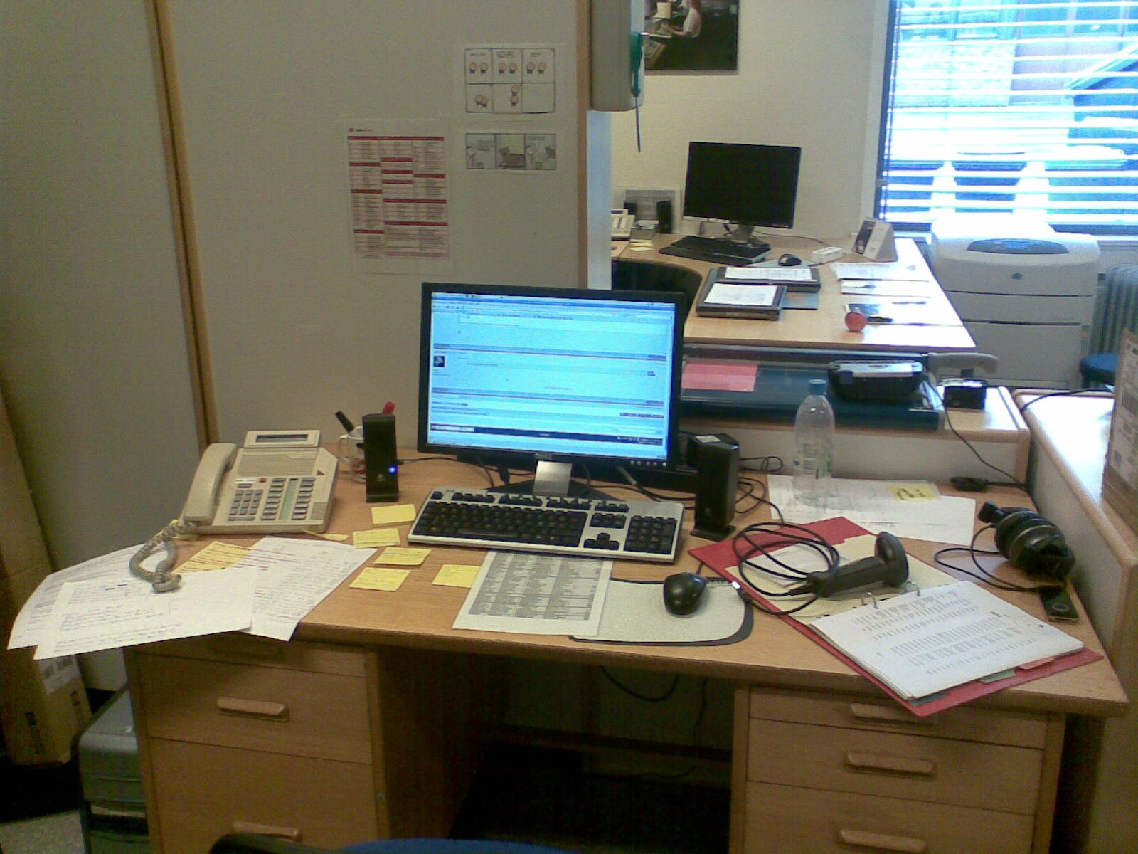j-- Skrevet 14. mai 2009 Skrevet 14. mai 2009 Her sitter jeg og jobber. Legg merke til webcomicstripene på hylla, og rotet med papirer