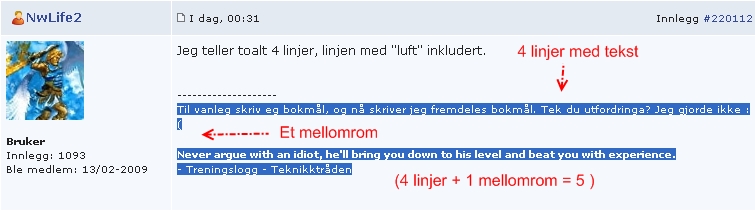 Natrich Skrevet 23. mai 2009 Skrevet 23. mai 2009 (endret) Jeg teller toalt 4 linjer, linjen med "luft" inkludert. Signaturen: Til vanleg skriv eg bokmål, og nå skriver jeg fremdeles bokmål. Tek du utfordringa? Jeg gjorde ikke Never argue with an idiot, he'll bring you down to his level and beat you with experience. - Treningslogg - Teknikktråden 4 linjer? Endret 23. mai 2009 av Natrich