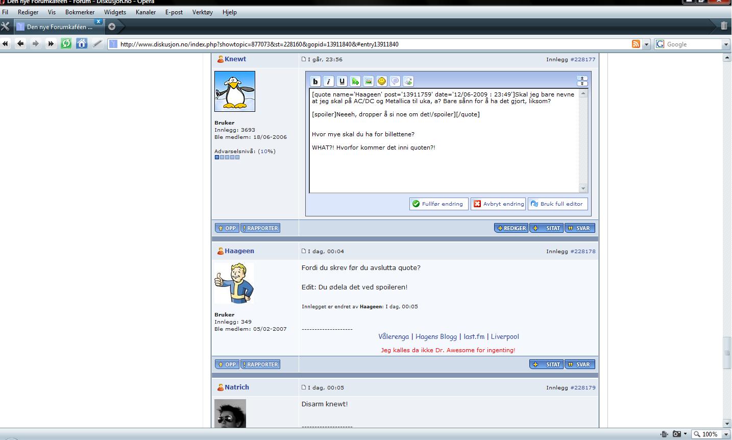 Firkantbar Skrevet 12. juni 2009 Skrevet 12. juni 2009 (endret) Fordi du skrev før du avslutta quote? Edit: Du ødela det ved spoileren! Endret 12. juni 2009 av Haageen
