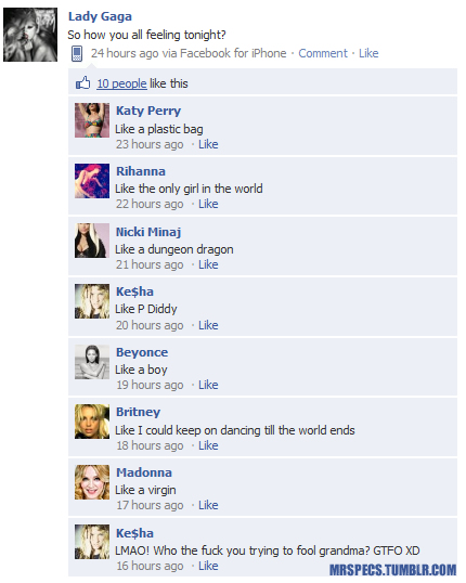 Eplefe Skrevet 2. juli 2011 Skrevet 2. juli 2011 trukke jeg tok den jeg heller. opptil flere der jeg ikke forsto /gammal/følger ikke med på ting Rihanna referer til "Only Girl in the World", Nicki Minaj til "Roman's Revenge", Ke$ha til "Tik Tok", Beyonce til "If I were a boy", Britney til "Till the world ends" og Madonna til "Like a Virgin".
