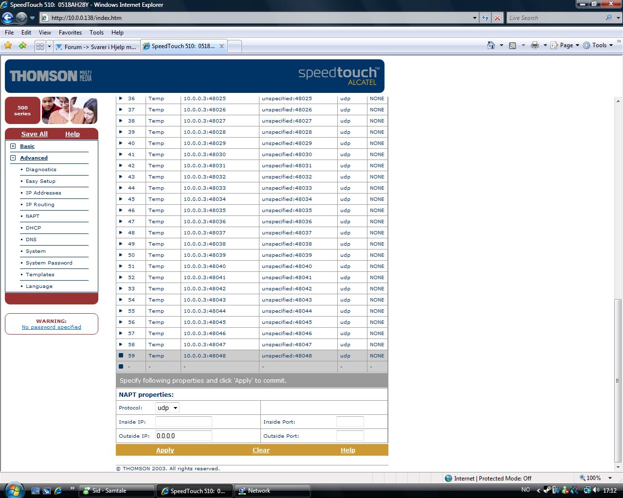 Bjørn Christiansen Skrevet 2. januar 2008 Skrevet 2. januar 2008 TCP: 3004UDP: 48000-48100 Eg bruker ein Thompson SPeedTouch 510 og har prøvd å opne så mange eg kan men kjeme ikkje meir ein rundt 48060. (UDP) etter det så får eg ikkje til å legge til fleire. Har nokon peiling på kva eg kan gjere Er det ikke muligheter til å stille inn portrange istedefor enkeltporter i routeren? (Kan ikkje bruke portforward programmet pga. eg ikkje har bruker/passord til ruteren. kan kun bruke websida til routeren pga brukeren og passordet er automatisk lagra der.) Ville anbefalt deg å satt nytt brukernavn og passord på routern din, så får du litt mer kontroll på nettlinja di.