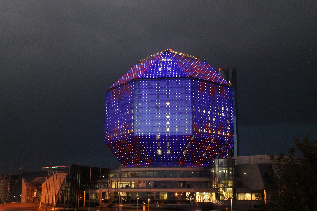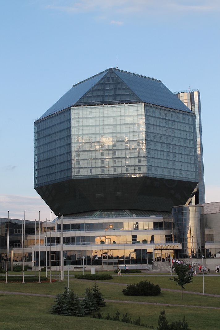 Kjeven Skrevet 18. januar 2015 Skrevet 18. januar 2015 Helt riktig! Første bilde er av Hviterusslands nasjonalbibliotek, som ble fullført i 2006. Er en fin utkikksplattform på toppen. Ryktet skal ha det til at konstruksjonen er ekstremt ustabil, og står i fare for å kollapse når som helst. Hvis man venter til etter solnedgang får man også med seg et aldri så lite lysshow: Neste bilde er av et monument jeg ikke husker hele navnet til, men som ble bygget etter at Minsk fikk status som "helteby" i Sovjetunionen, en tittel gitt til byer som utmerket seg under andre verdenskrig. Det virker dog som de har glemt å bytte ut flagget på toppen... Før videre!