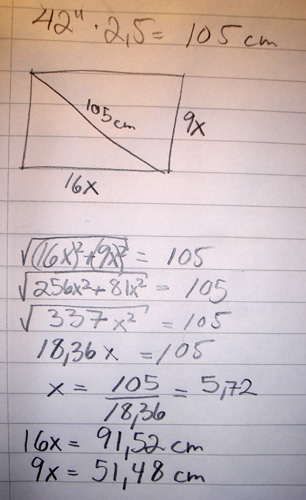 MrQuote-on-Quote Skrevet 4. januar 2008 Skrevet 4. januar 2008 (endret) Størrelsen for selve bildeflaten blir 91,52 cm x 51,48 cm. Så må det vel plusses på en halv cm eller noe for kanten på panelet, og hvis det er snakk om en tv så må selvfølgelig rammen til tven regnes med, men det er jo forskjellig for hver tv og det spurte du heller ikke om Legger ved utregningen nedenfor så du kan se hvor lett det er å regne det ut selv. Endret 4. januar 2008 av Irgendwer