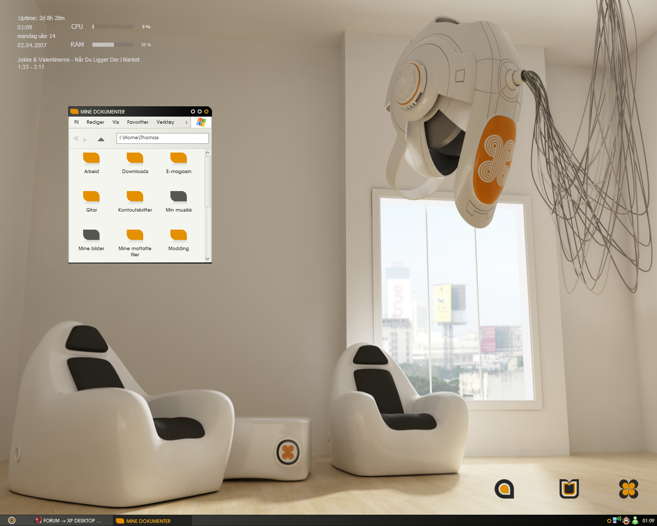 Bruker-93156 Skrevet 30. september 2008 Forfatter Skrevet 30. september 2008 Hm. Ryddig ja... Zodz: Ein kan ikkje alltid bruke den samme oppskrifta for oppskarping heile tida. Det må tilpassast både oppløysing og medie. Stemmer... Kan jo vise en tidligere desktop jeg hadde. Dette var når jeg drev med litt modding av Windows. Har gitt det opp nå, men bruker fortsatt Object Dock. Kunne aldri klart meg uten. Du ser kanskje at det står Opera over hennes venstre pupp? Jada! Jeg lagde det slik at hvis jeg trykket på hennes venstre pupp åpnet jeg Opera mens høyre pupp var MSN. Hodet var vel Min datamaskin og navlen Mine dokumenter. Føler meg litt stolt over den! H O W ? En av mine mest gjennomførte prosjekter. Er bakgrunnen annet enn bare en bakgrund? Altså er det noe mer enn et vanlig bilde? Hvordan får man tig på desktopen som er klikkbare?
