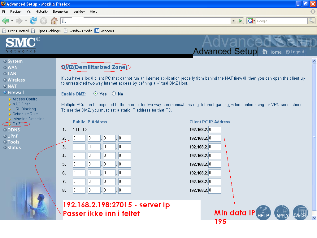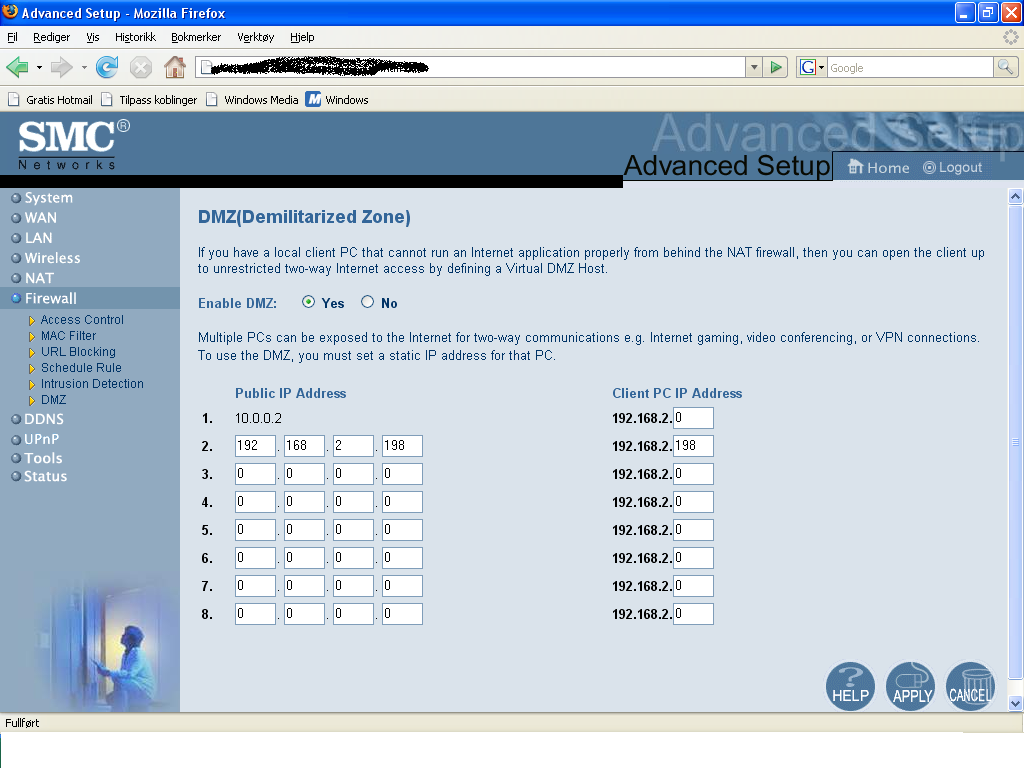 Chris17 Skrevet 22. januar 2008 Forfatter Skrevet 22. januar 2008 har routeren din DMZ ? isåfall setter du bare denne til din lokale IP adresse 192.168.2.198 og det skulle være det, da står din pc uten firewall, og du bør derfor kjøre en software firewall, hvis du bruker winXP vil jeg anbefale Sunbelt kerio personal firewall Ja men det er noe jeg lurer på SiriAMP, Hardde du giddet å vente litt eller følge med på denne tråden? Jeg logger på Smc nå og så poster jeg noen Screenshots fra redigerings siden til ruteren. Tar max 3 min Chris