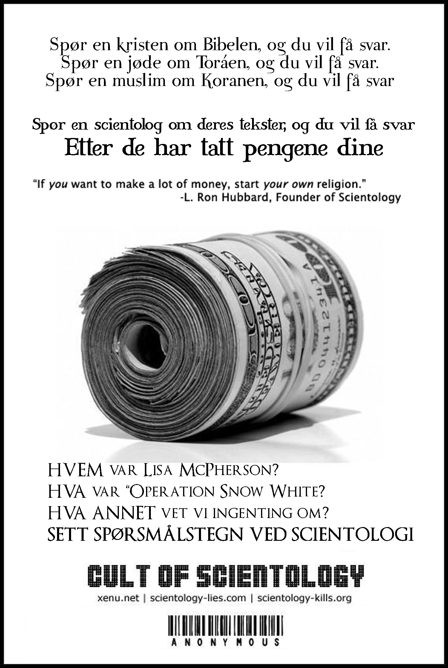 Gamlemor Skrevet 28. januar 2008 Skrevet 28. januar 2008 (endret) Flott, takk! L4r5: Jeg er ikke sånn superkjapp med PS, så jeg orker ikke nå. Kanskje jeg lager noe senere. Edit: Oppdaterte forrige flyer. Gadd ikke laste opp to. I mine ører klinger "Sett spørsmålstegn ved scientologi" hakket bedre ut enn "Still spørsmålstegn til scientologi" Men det er bare meg. Edit: Hmm, noen her som skal til London? Hadde egentlig planer om å dra til amsterdam litt etter den 10. men det ble avlyst, dette kunne kanskje blitt en fin trøst? hmm Endret 28. januar 2008 av Lord-Myrrah