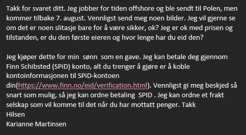 Drunkenvalley Skrevet 13. juli 2019 Skrevet 13. juli 2019 (endret) Eventyrene med bilen fortsetter. Prøver selge en RAV4. Kun to som har kontaktet meg. Eine prøvde to ganger med skambud og/eller svindel. Andre er følgende: Sender melding fra et Polsk nummer, med ønske om at eg kontakte dei via epost. Har ingen verifiserbar identitet. Jobber "offshore i Polen". Spør om info som er i artikkelen. Forteller dei ønsker å kjøpe bilen med SPiD konto. Ikkje er i landet, og aldri vil være i landet i relevant tidsperiode. Kjøper bilen i gave for sønnen. Vil bruke fraktselskap for å hente bilen. Nope, det gidd eg ikkje svare på ein gang. Tenke kanskje melde til politiet, men veit ikkje om det er vits? Men det var litt morsomt når eg la ut ein anna vare på finn no og fekk følgende varsel: Er det noe bingo-kort eg kan fylla ut her? Endret 13. juli 2019 av Drunkenvalley 2