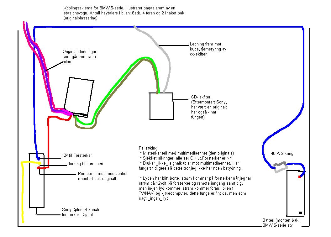 Sfinx Skrevet 16. februar 2008 Skrevet 16. februar 2008 Hei! Sliter ganske mye med min bilstereo i en 99 BMW 525TDS Stasjonsvogn. Er originalt TV/Navi/cd-skifter etc i bilen. Personen som har hatt den før meg har etterkoblet en forsterker bak i bilen til multimediaenheten (den originale hvor tv-radio etc går inn) som ligger også bak i bilen. Alt ser greit ut. Også har han satt inn en annen cd-skifter med styringseneht ved siden av rattet foran. Alt dette fungerer greit, eller det har fungert delvis hvertfall. Problemet er: Jeg tror uten å si det for sikkert, at det har blitt byttet til litt kraftigere høytalere i dørene foran og i taket bak, derav forsterkeren. Men er ikke sikker. Jeg har forsåvidt bare hatt lyd foran noen få ganger, blir borte ved kjøring på ujevn vei. Da spiller det bare bak. Og når lyden blir borte foran så ser det ut som at forsterkeren slår seg av. Nå har jeg ikke lyd noen plasser, pga sikringen fra strømen til forsterker har gått. Byttet denne, men ingen lyd kom tilbake. Kjøpt ny forsterker også. 4kanaler - digital. Sony Xplod. Men det blir ikke strøm på forsterkeren når jeg setter på 12v og jording. Skal det ikke bli strøm da uansett?? Sjekket jordingen ordentlig og strømen fra ledningen med multimeter, 12.6 får jeg, alt i orden. Er en liten ledning som er koblet til på remote tilkoblingen på forsterkeren(på den gamle), setter jeg den på forsterkeren skjer det heller ingenting. Men når jeg setter strøm på 12v+ på forsterkeren og remote samtidig, da kommer strømen til kjørekomputer og enheten foran i bilen(hvor TV/Navi etc er), men den slår seg ikke av når jeg tar av tenningen(det er vel pga av remote ledningen) - må slå den av manuelt. Noe jeg ikke ønsker. Var ikke sånn før heller. Mente at remoteledningen skulle gi strøm til forsterkeren og ikke omvendt.. pga at forsterkeren skal slå seg av når jeg tar av tenningen. Men uansett avhengig av remote eller ikke, så kommer det ingen lyd i høytalerne, hverken foran eller bak. Jeg mistenker kanskje den originale enheten bak. Kanskje det har skjedd noe med den. Men det må ha vært en kortslutning i bilen hvertfall, siden hovedsikringen til strømledningen gikk. Har gått over andre sikringer og de ser greie ut. Jeg finner rett og slett ikke ut av dette. Det er MYE elektronikk i BMW`en. Tror jeg skal prøve å få tak i noen spesialister som kan se på den. Jeg har problemer med å forstå hvorfor forsterkeren går i protection. Noen som har vært borti noe lignende? Eller har noen gode tips på hva jeg bør gjøre? Det ser ikke ut som om det har blitt rotet med noe elektrisk anelgg i bilen bortsett fra den enheten bak. Når strømen er på så fungerer kjørekomputer/Navi/tv osv helt fint så det er bare lyden og koblingen til forsterkeren som det er problemer med.. Nå er ikke jeg noen ekspert på bilstereo selv om jeg har skrudd en del,så jeg takker for alle hjelpsommme tips dere kan komme med. MÅ få lyd i bilen Hvis dere vet om noen gode bilstereoeksperter i Lillehammer/Gjøvik området så si gjerne ifra Og hvordan pleier prisene å være på å gi fra seg bilen for å få eksperter til å gjøre noe? Koster det flesk eller? Det virker jo som et omfattende arbeid i grunn. Hvis det er noe dere lurer på for å få klarhet i problemene så bare si ifra,så skal jeg svare så godt jeg kan Mvh Ingen bilstereoguru Erik Se vedlagt koblingsskjema.