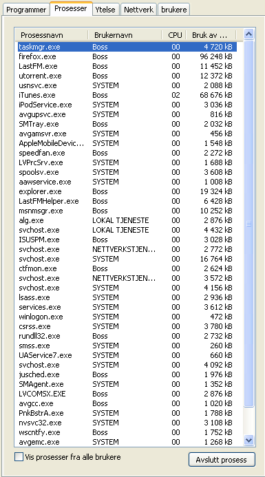 Fritidsproblem Skrevet 1. mars 2008 Forfatter Skrevet 1. mars 2008 jeg ser at du har ca 47 prosesser gående, prøv å kutte ned en del av disse og prøv å brenne igjen. ( en del av disse bruker vel mye av minne ditt .) lykke til hmmm.. jeg har prøv det men det hjelpte ikke så mye=/ du kjører mye tung programmvare og vis du har litte minne burde du kanskje vurdere mer minne, vis minnet er fult og windows s kriver mye til page fil er det et problem. spesielt når du skal brenne prøv å kutte ut så mange programmer om gangen. sjekk at du ikke har fått noe på pcen som ikke skal være der. jeg kjenner ikke specsene til pcen din heller. du er nok nødt til å gi mer informasjon for at vi skal kunne hjelpe deg. hmmm.. var nå rart att den plutselig skulle bli slik da=/ hva mener du me specsene??