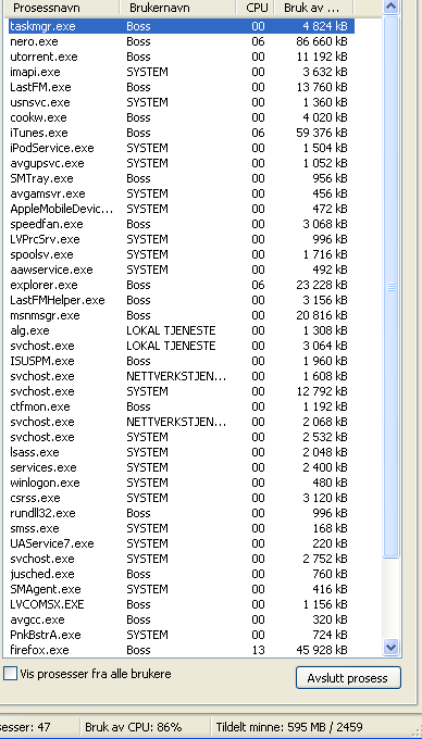 eladmir Skrevet 27. februar 2008 Skrevet 27. februar 2008 jeg ser at du har ca 47 prosesser gående, prøv å kutte ned en del av disse og prøv å brenne igjen. ( en del av disse bruker vel mye av minne ditt .) lykke til hmmm.. jeg har prøv det men det hjelpte ikke så mye=/ du kjører mye tung programmvare og vis du har litte minne burde du kanskje vurdere mer minne, vis minnet er fult og windows s kriver mye til page fil er det et problem. spesielt når du skal brenne prøv å kutte ut så mange programmer om gangen. sjekk at du ikke har fått noe på pcen som ikke skal være der. jeg kjenner ikke specsene til pcen din heller. du er nok nødt til å gi mer informasjon for at vi skal kunne hjelpe deg.