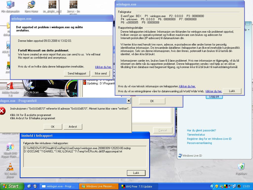 Bruker-111299 Skrevet 9. mars 2008 Forfatter Skrevet 9. mars 2008 Jeg vil virkelig anbefale å gå gjennom hva som startes opp i Windows ved hjelp av Autoruns fra Windows Sysinternals. Huk bort det som kan virke mistenkelig og se om problemet bedrer seg.Evt kan du feilsøke den user-mode dumpen som ble lageret når problemet oppsto (Banen ble vist i feilmeldingen) ved hjelp av Windbg og se på stakken. (Se min guide for feilsøking av windows for hjelp for hvordan dette kan gjøres) Får ikke åpna den, da den er 0 byte.